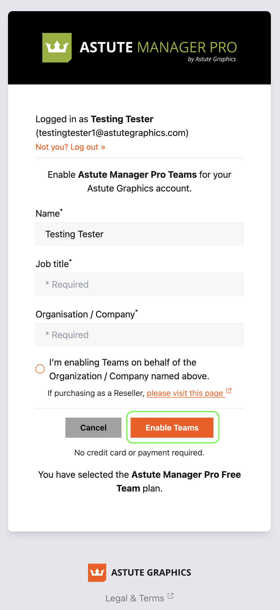 You will see confirmation that you now have an Astute Manager Pro Team account.