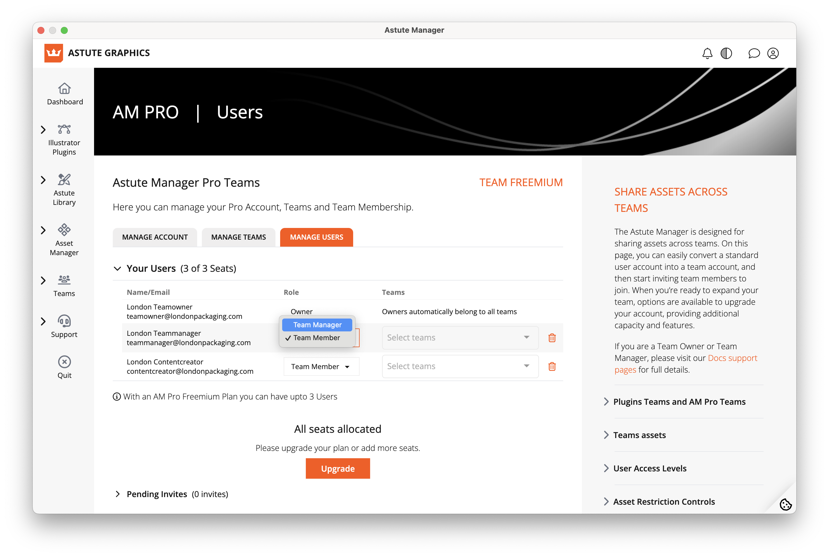 Astute Manager Pro Teams provides control over asset pack access (per team) and user levels (Owner, Manager, Member).