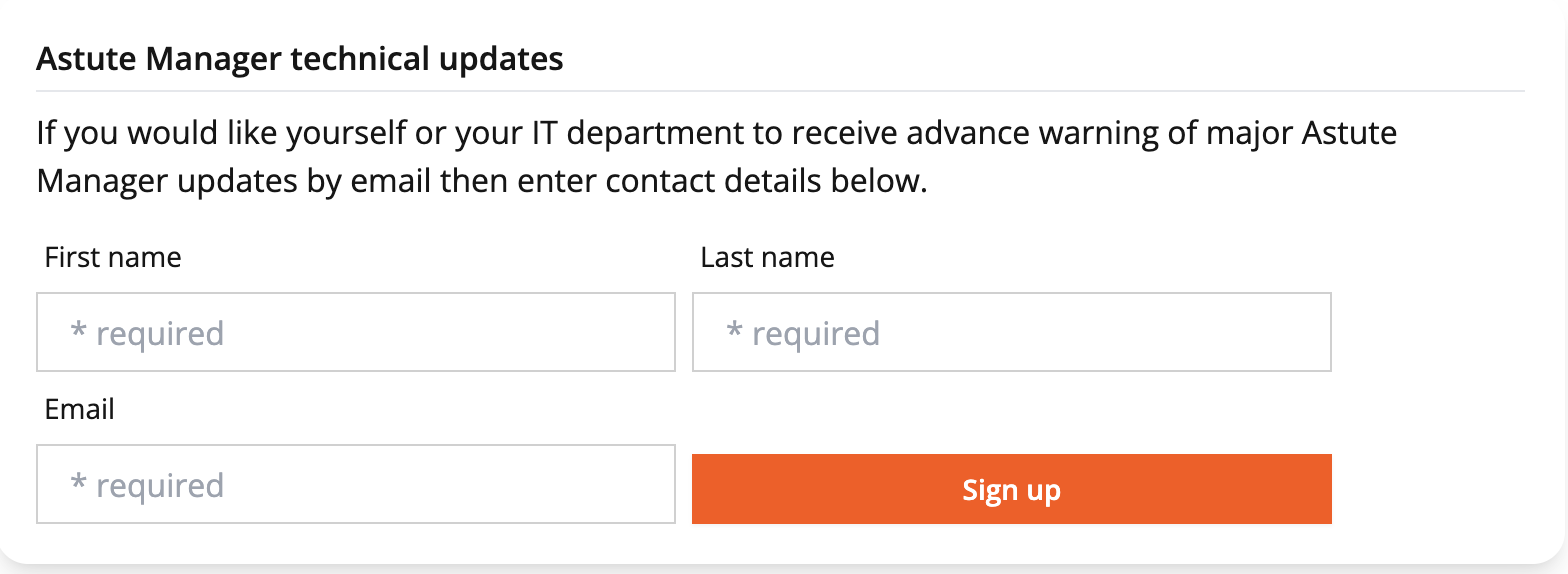 Team Owners and Team Managers can opt in to receive advance warning of any impending major Astute Manager updates. You can also request for a member of your IT department to receive these updates.