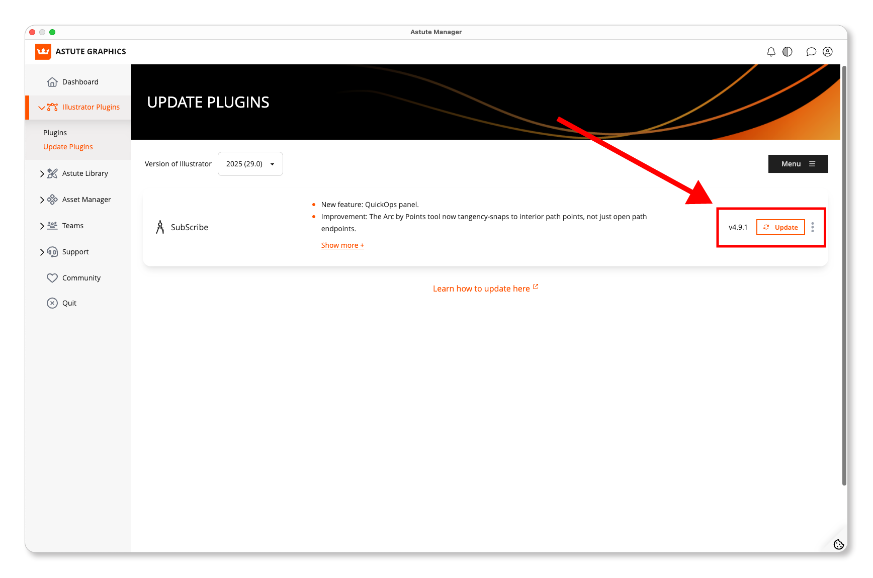 If you have previously installed plugins and updates become available, you may see an “Update/s” notification in the Illustrator Plugins section of the Astute Manager.